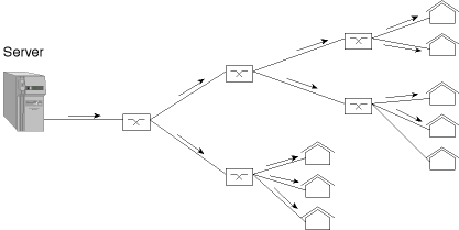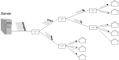 Sollen mit Hilfe von TCP-Verbindungen viele Nutzer mit dem gleichen Inhalt von einem Server versorgt werden, muß jeder Nutzer eine eigene Verbindung zum Server aufbauen (Abbildung 1). Der Bandbreitebedarf wächst dadurch linear mit der Teilnehmerzahl, da der Server jeweils eine Verbindung pro Client und Request unterhält. Selbst wenn mehrmals die gleichen Inhalte vermittelt werden sollen, erfolgt keine Konzentration, um Bandbreite zu sparen. Daß ein solches Vorgehen nicht besonders effektiv ist, liegt auf der Hand, allerdings ist TCP auch nicht unbedingt für solche Verkehrsformen wie Broadcasting gedacht gewesen.