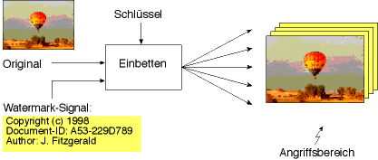 Beim Watermarking werden in digitale Mediendaten z.B. Informationen über den Urheber der Daten eingebettet. Die mit dem Original festverbundene, eingebettete Information wird als Watermark bezeichnet (Abbildung 4). Dieser Einbettungsprozeß muß so robust erfolgen, daß es unmöglich ist, das Watermark unberechtigt zu entfernen, wenn der Angreifer versucht, das Objekt zu manipulieren. Dabei sind viele verschiedene Manipulationen denkbar: Analog-Digital-Wandlung, Digital-Analog-Wandlung, Ausdrucken und erneutes Einscannen, Verändern von Größe, Auflösung, Farbtiefe, Kompression, Verzerrung, Ausschneiden von Bildteilen. Weiterhin dürfen die Mediendaten natürlich nicht durch das Watermark beeinträchtigt werden.