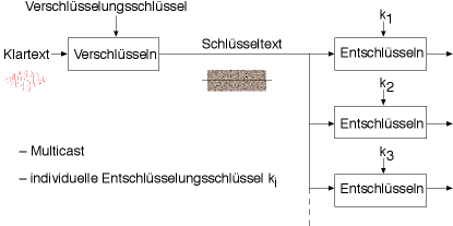 Die Sicherheit eines Verschlüsselungsverfahrens mit gleichem Schlüssel für alle Teilnehmer (siehe vorangegangener Abschnitt) hängt entscheidend vom physischen Schutz des Schlüssels ab. Physischer Schutz gelingt jedoch bestenfalls für eine beschränkte Zeit, da immer wieder einmal neue Methoden zum unberechtigten "Auslesen" von geheimen Informationen z.B. aus Chipkarten gefunden werden. Besser wäre es also, wenn jeder Kunde einen eigenen individuellen Schlüssel zur Entschlüsselung des Medienstroms bekäme. Ein Verschlüsselungsverfahren, mit dem es möglich ist, einen einzigen verschlüsselten Medienstrom an alle Empfänger zu senden, der dann mit mehreren individuellen Schlüsseln entschlüsselt wird, wird als Gruppenverschlüsselung (auch: Broadcast Encryption) bezeichnet (Abbildung 6).